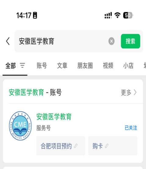 手机端:微信关注服务号“安徽医学教育”,如图(5);关注后点击“服务”,点击“IC卡学分查询”,如图(6);点击“继教项目预约”进行,如图(7)