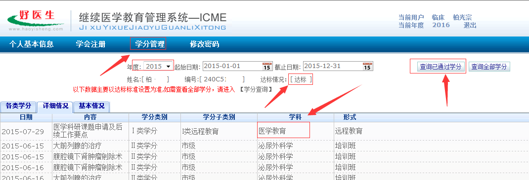 登陆(网址:icme.haoyisheng.com)继续医学教育管理系统(ICME)→用户名是IC卡卡号(英文字母大写),初始密码:000000→学分管理→达标情况查询或学分查询,可以查看到当年度的学分情况,也可以选择年度、时间进行精确查询某个年度或者某段时间内获得的学分情况。